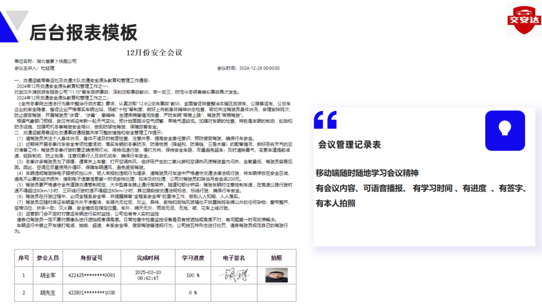随时随地高效学:驾驶员通过手机即可利用碎片时间完成安全学习,系统自动记录学时与考核结果。